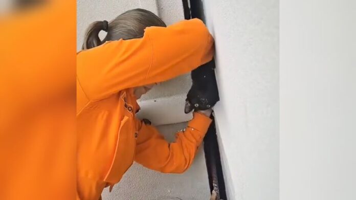 Bombeiras resgatam gato preso em parede e momento viraliza nas redes