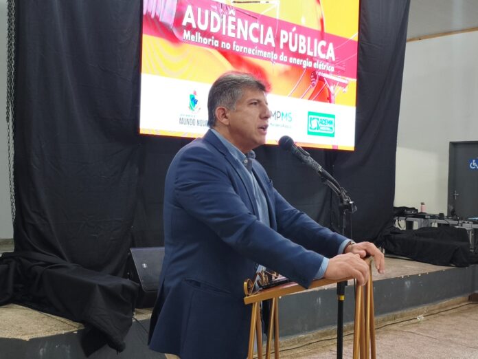 deputado estadual Lidio Lopes participou, na noite de sexta-feira, 27 de março de 2026, da audiência pública realizada no Conviver Daudt Conceição, em Mundo Novo, para discutir a qualidade do fornecimento de energia elétrica pela Energisa no município e em toda a região do Cone Sul. O encontro foi promovido pela Prefeitura e pela Câmara de Vereadores, com a presença de representantes da AGEMS, Ministério Público, Defensoria Pública, Energisa, Associação Comercial e diversas lideranças.
